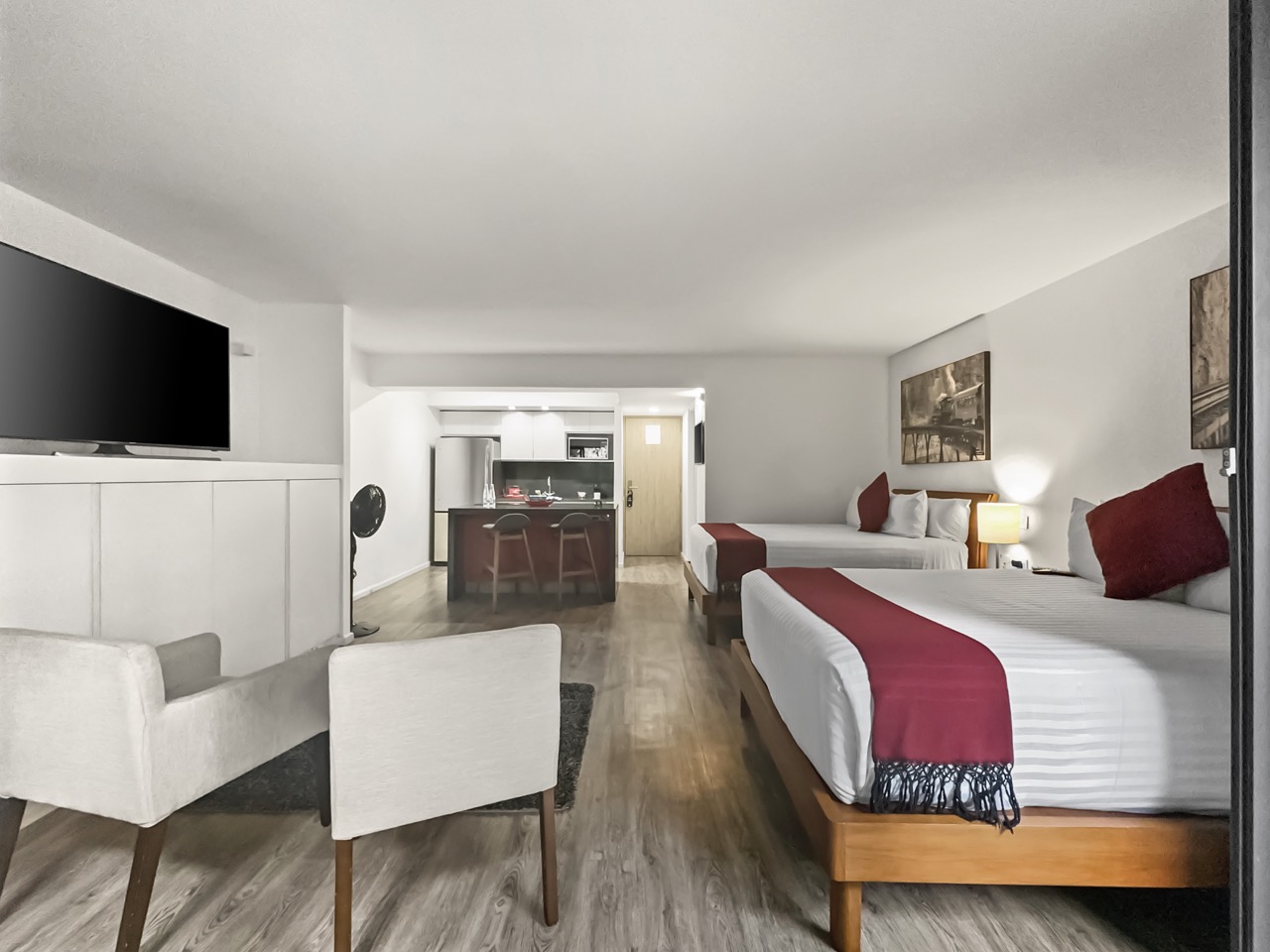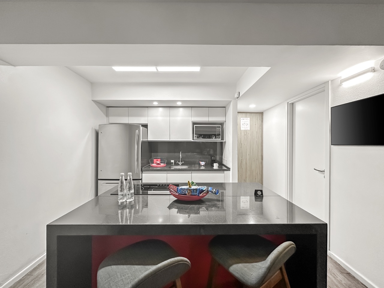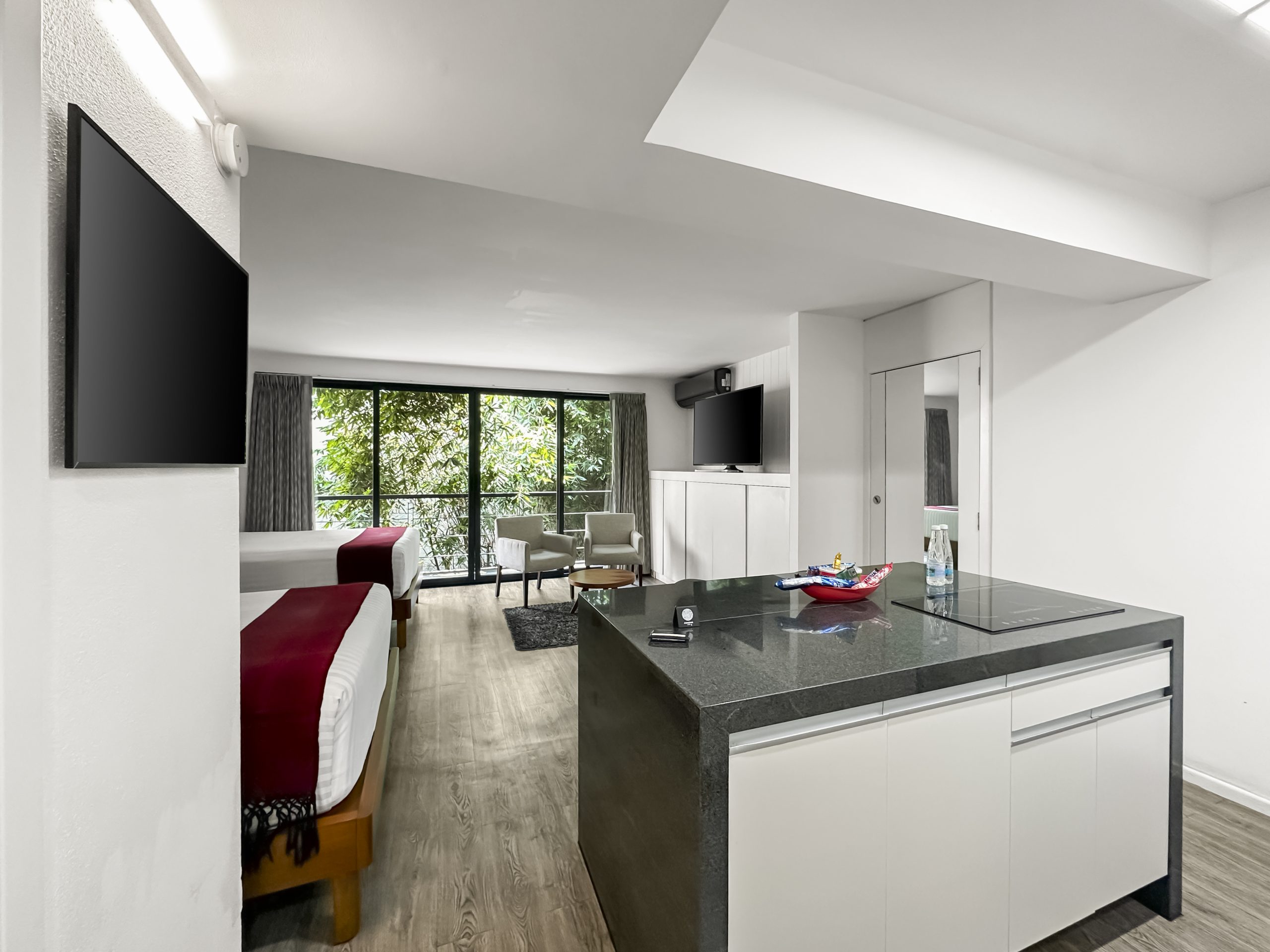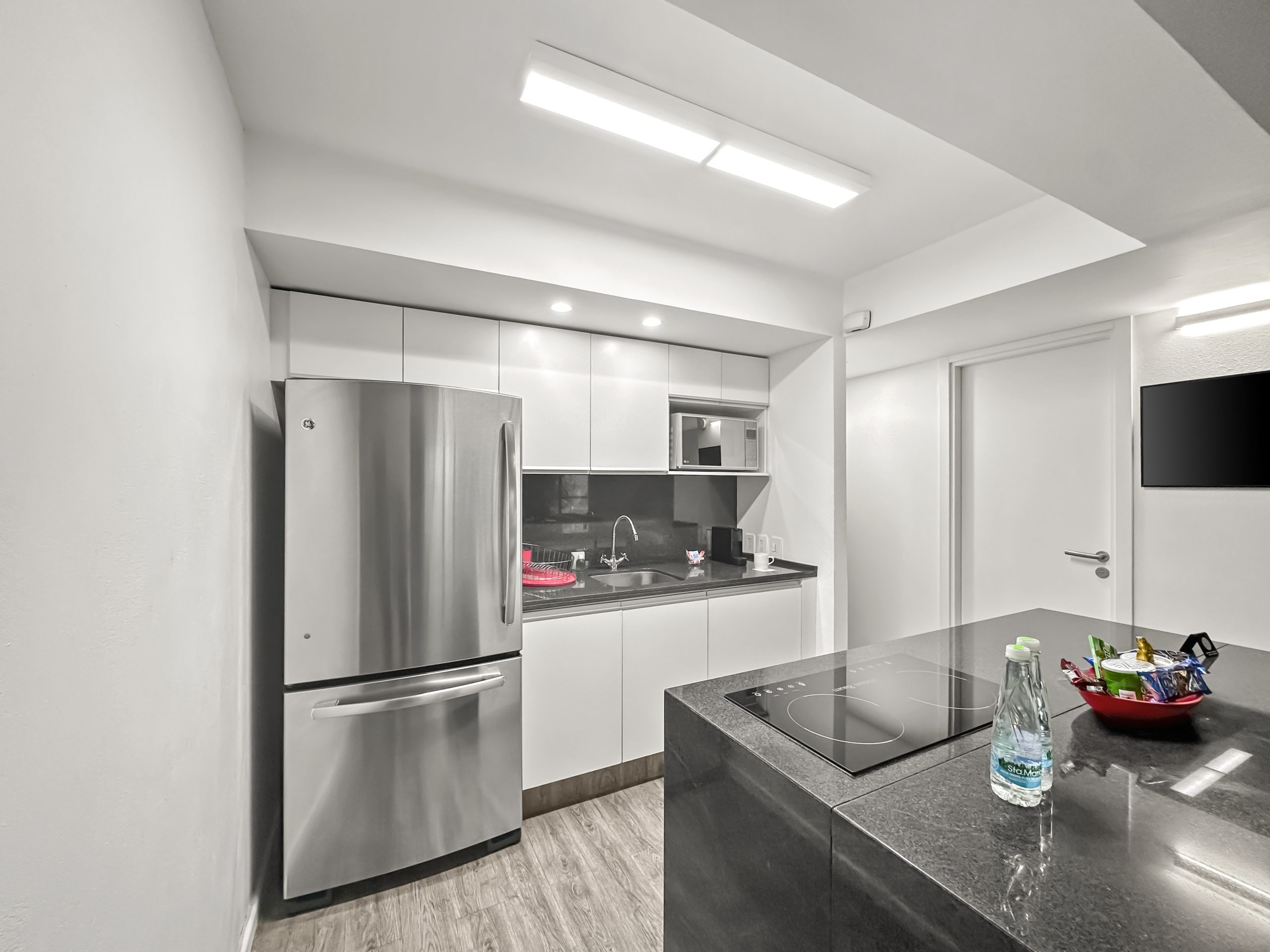 Alimento y bebidas: Cocina con refrigerador, parrilla de inducción, tostador, cafetera Nespresso, microondas, utensilios de cocina.