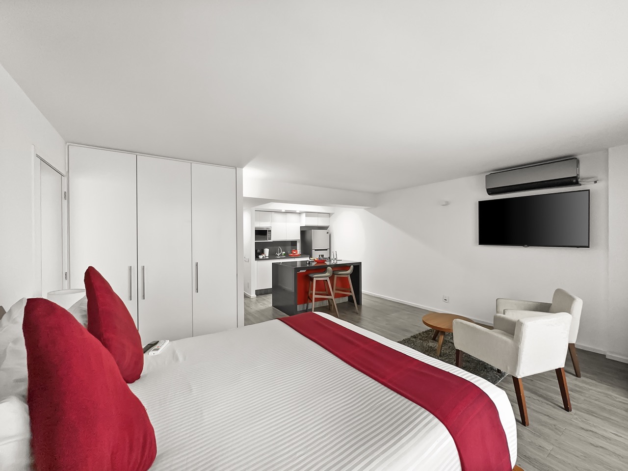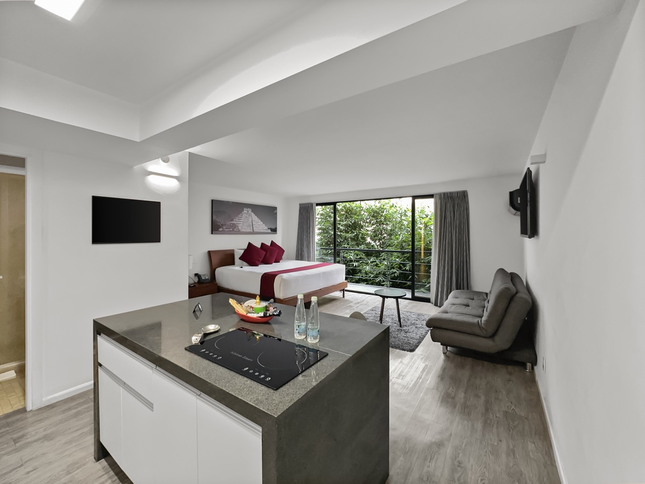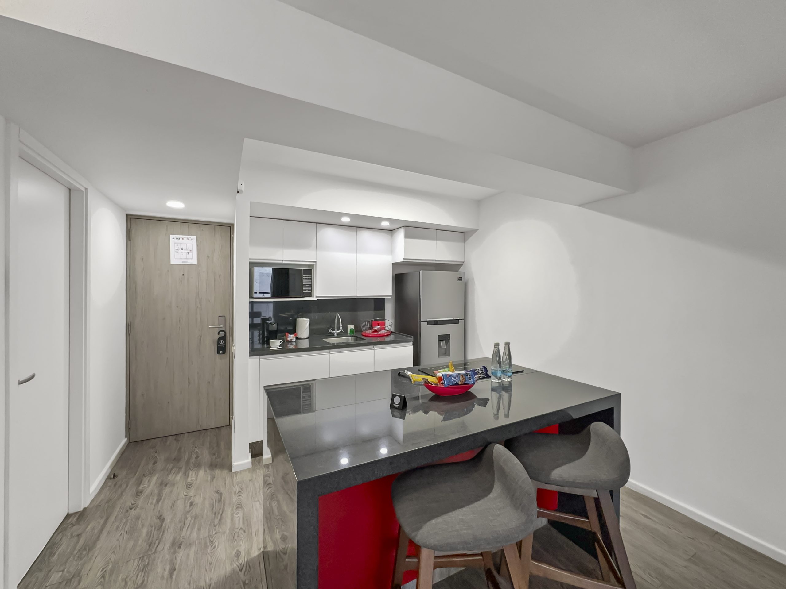 Alimento y bebidas: Cocina con refrigerador, parrilla de inducción, tostador, cafetera Nespresso, microondas, utensilios de cocina.
